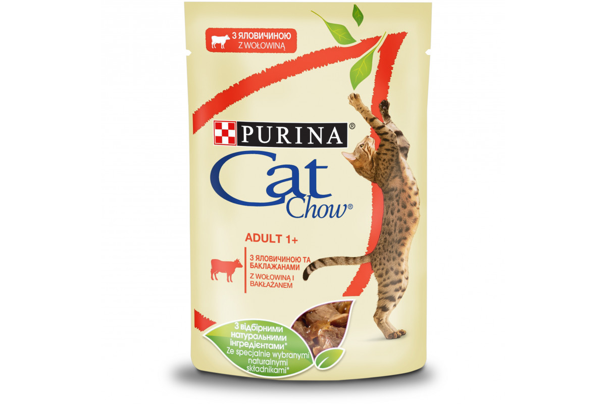 Cat Chow (Пурина Кэт Чау). С говядиной и баклажанами. Нежные кусочки в желе. Консервированный порционный полнорационный корм для взрослых кошек. 85гCat ChowНе доступно